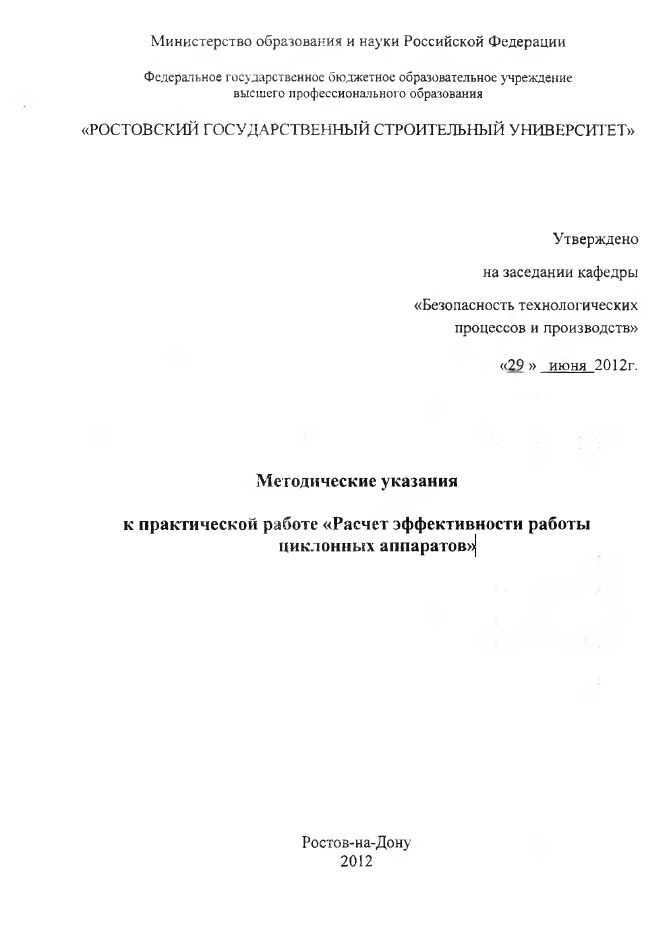 Содержат расчеты эффективности работы циклонных аппаратов к практической и контрольной работам по дисциплине «Охрана воздушного бассейна». Методические указания так же могут быть использованы при подготовке раздела «БЖД» выпускной квалификационной работы студентов строительных специальностей.