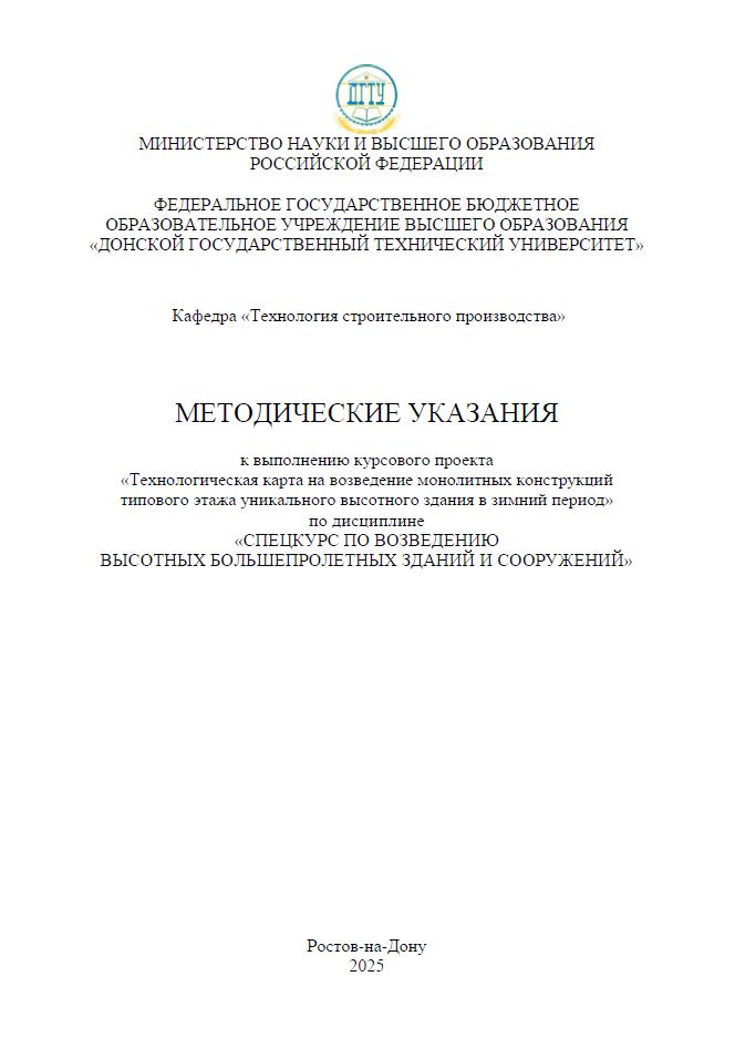 Кратко изложены требования к содержанию, оформлению и порядку выполнения курсового проекта «Технологическая карта на возведение монолитных конструкций типового этажа уникального высотного здания в зимний период».
