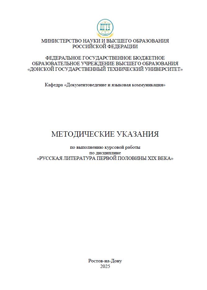 Содержат информацию по выполнению курсовой работы (порядок подготовки, организация защиты, рекомендации по содержанию, требования к оформлению, критерии оценивания) по дисциплине «Русская литература первой половины ХIХ века» для обучающихся всех форм обучения по направлению подготовки 44.03.05 Педагогическое образование (с двумя профилями подготовки) «Русский язык и литература».