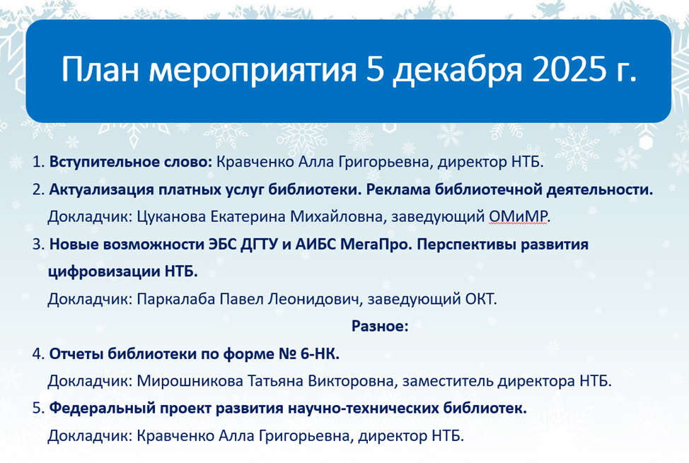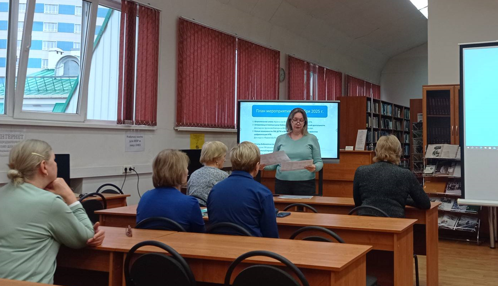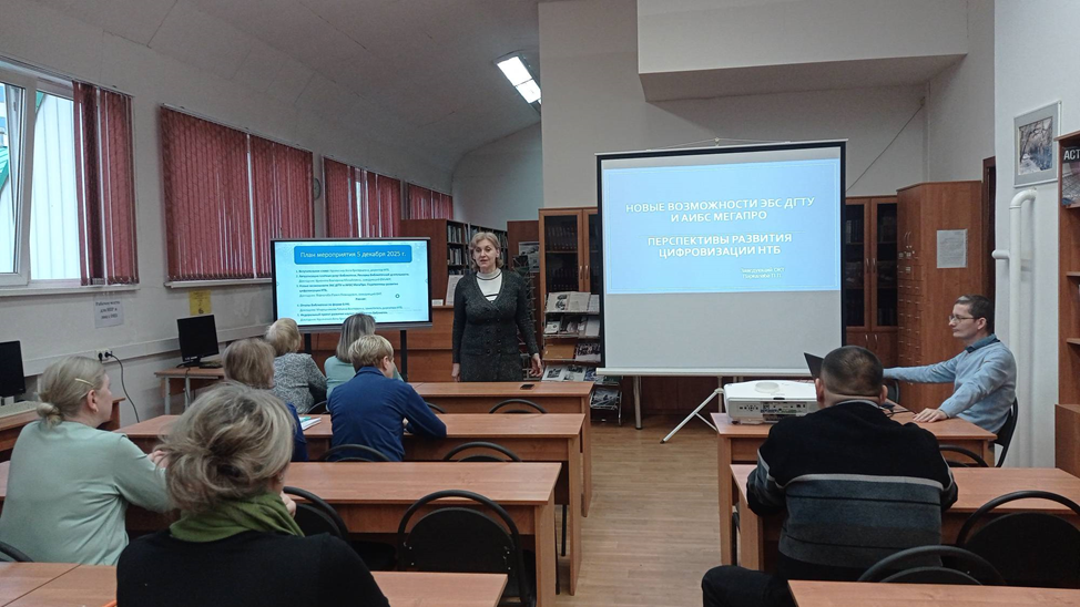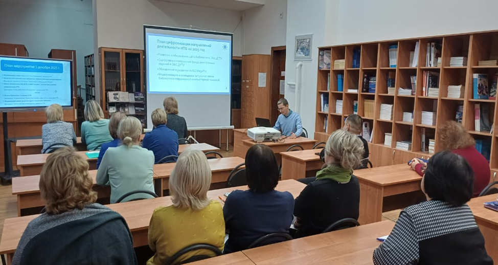 5 декабря 2025 года в читальном зале НТБ (8-609) прошел семинар в рамках мероприятий по повышению квалификации библиотечных работников. На встрече были рассмотрены следующие вопросы: актуализация платных услуг, реклама в библиотечной деятельности, обновление электронных сервисов НТБ, план и перспективы развития цифровизации направлений деятельности библиотеки, отчетность библиотек по форме № 6-НК.